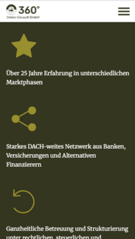 Die Website haben wir im Content Management System TYPO3 neu strukturiert und auf Basis des neuen CDs gestaltet und auf der Basis ein dreiseitiges Unternehmensprofil erstellt, das das Markenversprechen, die Leistungsbereiche, die Werte und die Personalisität von 360° Immo Consult vermittelt.